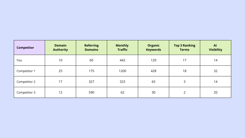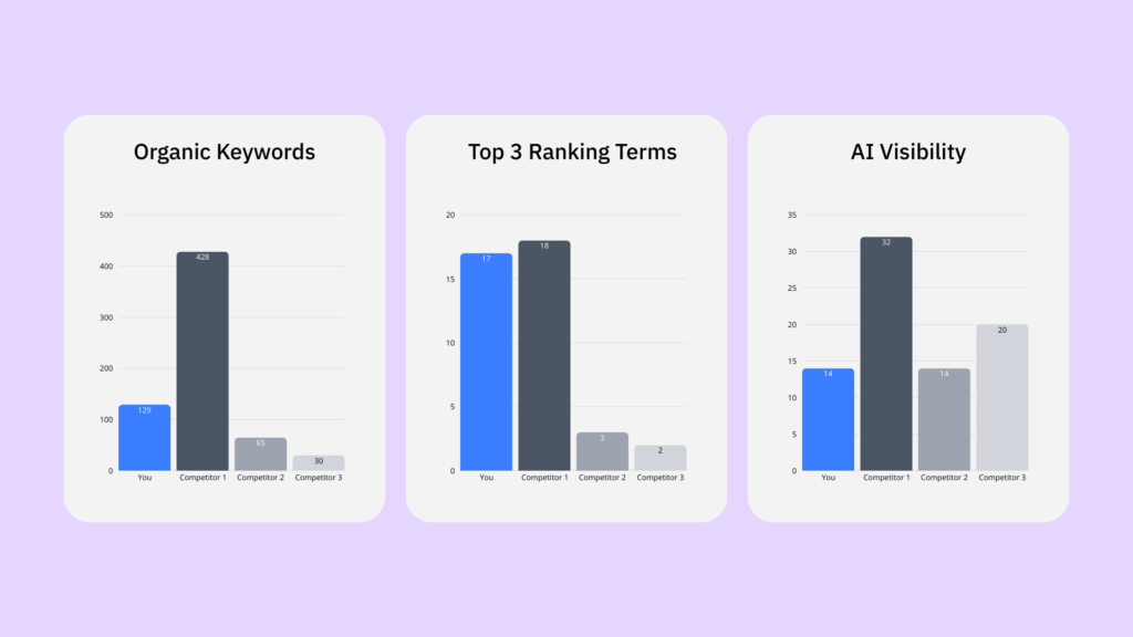 Side-by-side analysis of your website versus top competitors, including authority, referring domains, traffic, organic keyword rankings, and AI visibility. Instantly see who’s ahead and by how much.