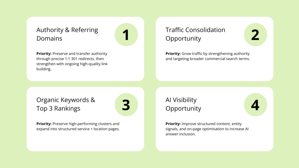 Clear interpretation of your performance data, explaining why competitors outrank you, where authority or content gaps exist, and what’s driving their visibility. Understand what the numbers actually mean.